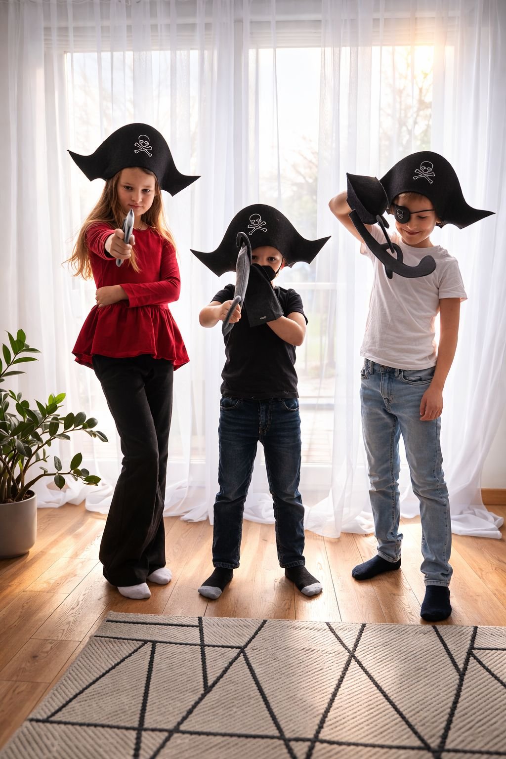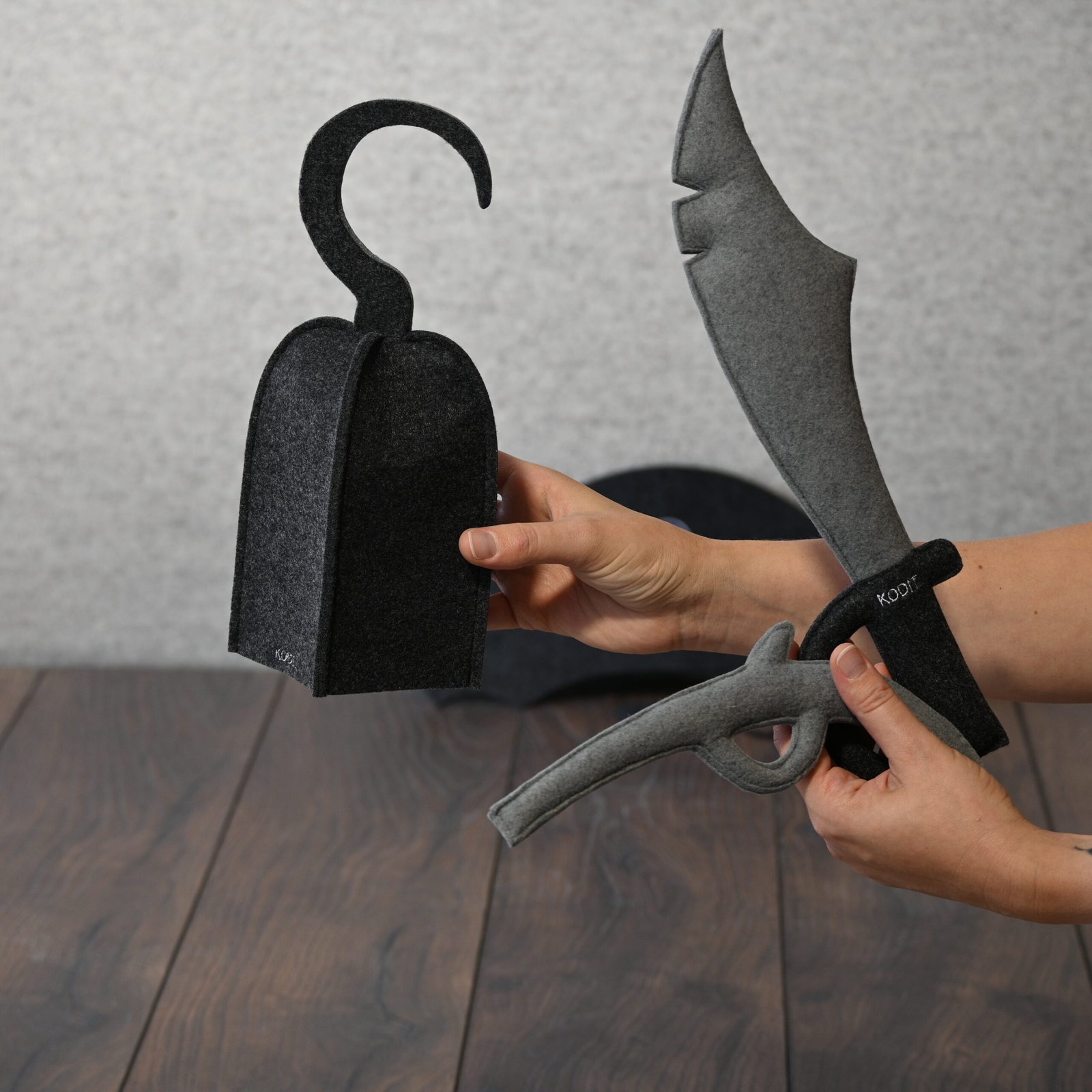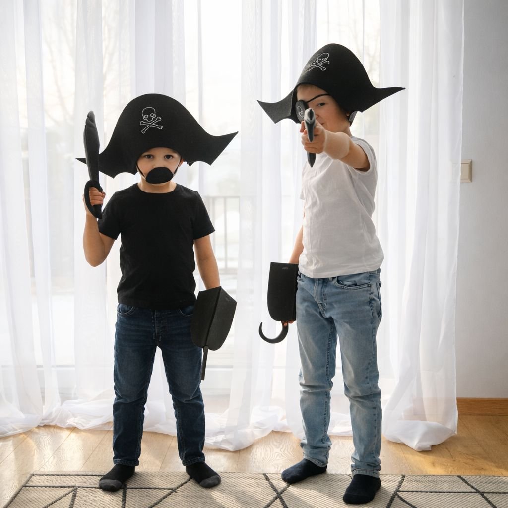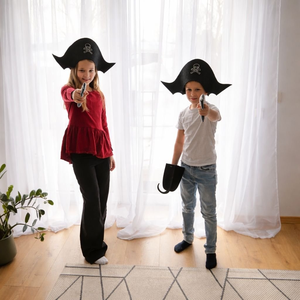 Dodieties bezgalīgos piedzīvojumos ar šo rokām darināto filca pirātu aksesuāru komplektu! Tas ir ir lieliski piemērots iztēles bagātām rotaļām, kostīmu ballītēm vai foto rekvizītiem, ļaujot mazajiem pirātiem izpētīt savu pasauli radoši, droši un jautri.
